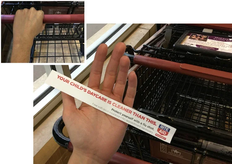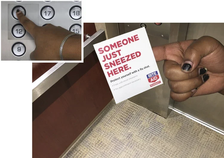 We placed camouflaged stickers on high-touch surfaces where people are most likely to pick up flu-causing germs. Each sticker was applied with double-sided tape, allowing it to transfer onto a person while using a shopping cart or elevator.