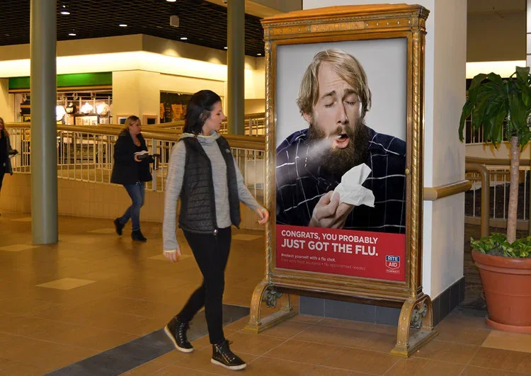 To raise awareness around flu shots at Rite Aid, we created a motion-detected point-of-purchase display that released a light mist when shoppers walked by. The headline read, “Congrats, you probably just got the flu,” using humor and surprise to spark conversation and drive action.